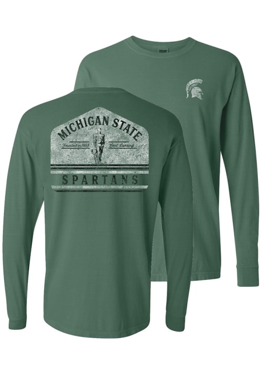 Show your Michigan State Spartans spirit in this MSU Green T-Shirt! This MSU Campus Long Sleeve T-Shirt makes a great layer for cooler nights cheering on the Spartans. Featuring a screen print team logo on left chest with screen print school landmark on center back, this Michigan State Spartans Long Sleeve LS Tee is an essential addition for every fan. Go Spartans!