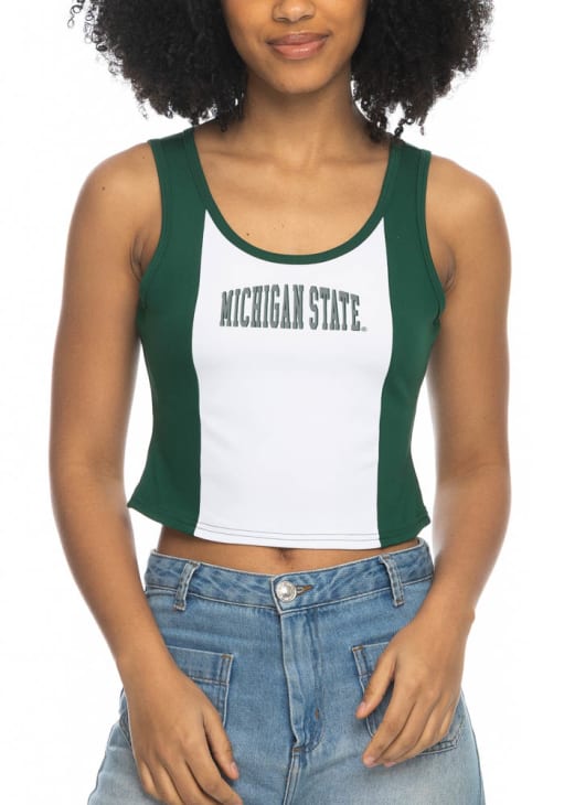 Elevate your tailgating style with this Michigan State Spartans Womens Tank Top. Stay fashionable and comfortable in the refreshing Green Colorblock Sleeveless Shirt. Discover the enticing details of this MSU Tank Top, showcasing a screen print team name on center chest that's sure to impress.