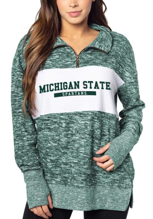 Embrace the warmth and showcase your Spartans pride with our Michigan State Spartans Long Sleeve Qtr Zip. This Womens Green Cozy Design Long Sleeve Pullover offers a screen print team name and logo on center chest for the perfect combination of comfort and style. Elevate your everyday look with this must-have Michigan State Spartans Long Sleeve Qtr Zip.