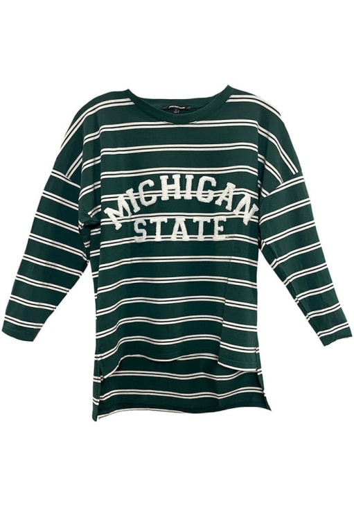 Show your Michigan State Spartans spirit in this MSU Green T-Shirt! This MSU Maldives Tunic Long Sleeve T-Shirt makes a great layer for cooler nights cheering on the Spartans. Featuring a chenille applique on center front, this Michigan State Spartans Long Sleeve LS Tee is an essential addition for every fan. Go Spartans!