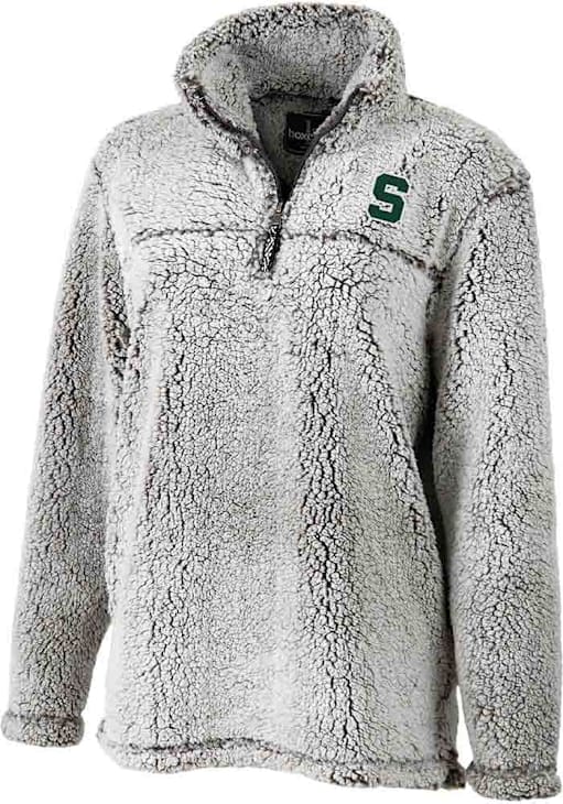 Embrace the warmth and showcase your Spartans pride with our Michigan State Spartans Long Sleeve Qtr Zip. This Womens Grey Sherpa Long Sleeve Pullover offers a embroidered team logo at left chest for the perfect combination of comfort and style. Elevate your everyday look with this must-have Michigan State Spartans Long Sleeve Qtr Zip.