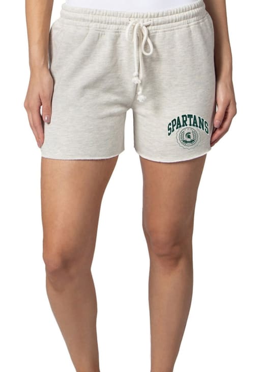 Take your workout to the next level in these Michigan State Spartans Womens Grey Sweat Shorts! These MSU Shorts are great for any Spartans fan who wants to show off their team spirit during their fitness routine. These Michigan State Spartans Shorts feature a screen print team name and faux seal on left hip.
