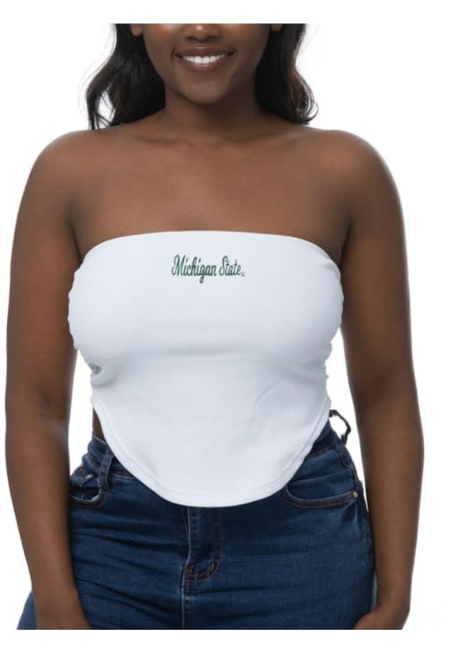 Elevate your tailgating style with this Michigan State Spartans Womens Tank Top. Stay fashionable and comfortable in the refreshing White Ruched Sleeveless Shirt. Discover the enticing details of this MSU Tank Top, showcasing a embroidered team name on center chest that's sure to impress.