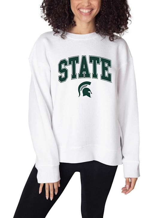 Gear up for the ultimate game day experience with this remarkable Michigan State SpartansWomens White Sunset Crew Sweatshirt! Designed with the true fan in mind, this Spartans Long Sleeve Sweatshirt features a screenprint team name and logo on center chest. Stay warm and comfortable with this Womens MSU Spartans Crew Sweatshirt.