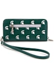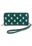 Product Details Product Details Measures 7.5" x 4" x 1.75"Synthetic leather8 card slots, 2 bill slotsWrist strapExterior Zipper Pocket Officially Licensed Carry your cash and show Spartans spirit in one go with this Michigan State Spartans Wristlet Wallet Womens Wallets! Rally House has your ideal Wallets in stock, which features a team logo on team color background.