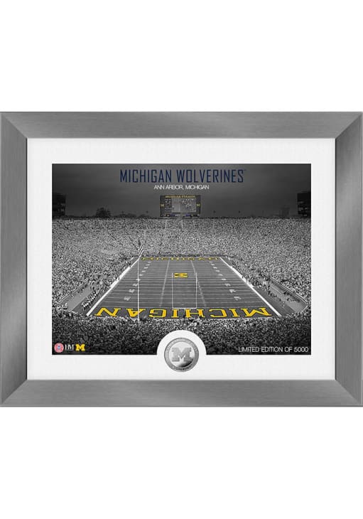 A way to show your team spirit is with this Michigan Wolverines Art Deco Stadium Coin Photo Mint Plaque. This Plaque features a 13”x16” limited edition collectible frame with your teams home field combined with a minted team coin.