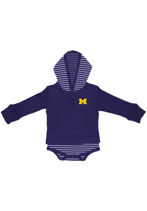 Your little Wolverines fan will look cozy and adorable in this Baby Blue Michigan Wolverines Stripe Hooded One Piece! This Michigan Wolverines Romper features a heat sealed team logo on center chest.
