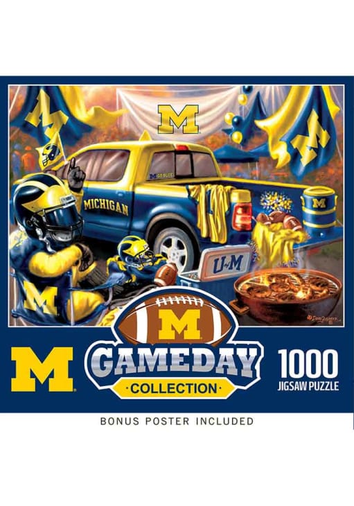 Product Details Product Details 1000 PiecesTailgate themed designsFeatures team logo and team colorsMakes for a great giftSuitable for framing when assembledMasterPieces - An American Puzzle & Game Company Officially Licensed Give yourself a challenge putting together this Michigan Wolverines Gameday 1000 Piece Puzzle. This Puzzle features a tailgate theme with team logo and team colors.