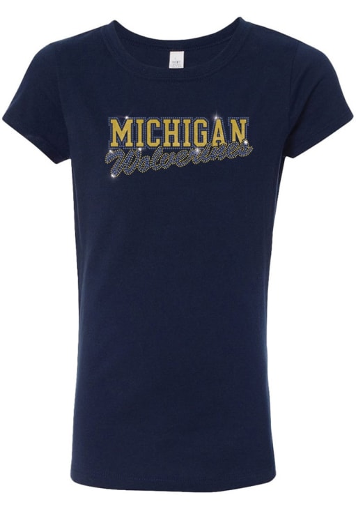 Show your support for Wolverines in this Girls Blue Michigan Wolverines Short Sleeve Fashion Tee! This Bling Script Fashion T-Shirt features a rhinestone team name on center chest that pairs perfect with any wardrobe. Get ready to show pride for your favorite team as you cheer "Go Michigan"