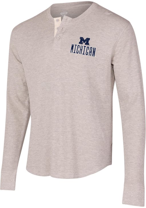 Show your Michigan Wolverines spirit in this Michigan Grey T Shirt! This Michigan Region Thermal Long Sleeve T Shirt makes a great layer for cooler nights cheering on the Wolverines. Featuring a distressed screenprinted team logo on left chest, this Michigan Wolverines Long Sleeve Tee is an essential addition for every fan. Go Michigan!