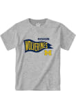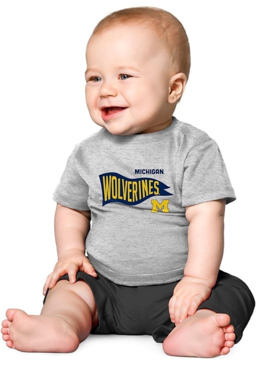Product Details Product Details Super soft knobby materialVintage feelCrew neckScreen print team graphic on center chestPerfect addition for any young sports fan!POLY / COTTON BLENDMachine washable Officially Licensed Every future Michigan Wolverines fan need a Grey Infant Short Sleeve Tee. This Knobby Retro T-Shirt features a screen print team graphic.