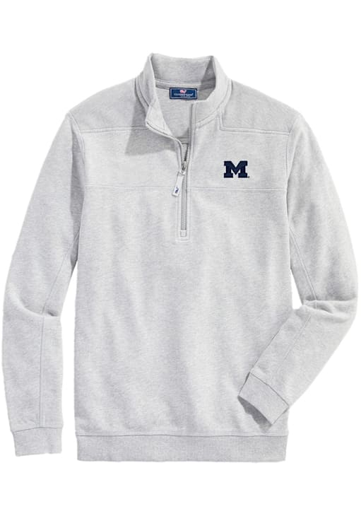 Embrace the warmth and showcase your Wolverines pride with our Michigan Wolverines Long Sleeve Qtr Zip Pullover. This Mens Grey Shep Shirt Long Sleeve Pullover offers a team logo on left chest for the perfect combination of comfort and style. Elevate your everyday look with this must-have Michigan Wolverines Long Sleeve Qtr Zip Pullover.