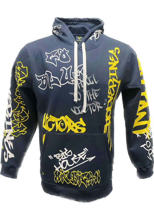 Embrace your Wolverines pride and showcase your team spirit with confidence in this Michigan Wolverines Long Sleeve Hoodie! Stay warm and stylish with the Michigan Mens Navy Blue Grafitti Hooded Sweatshirt. Designed with screenprinted grafitti style team sayings all over, this Wolverines Long Sleeve Hoodie is a must-have for dedicated fans.