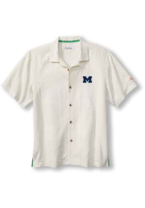 Mens Michigan Wolverines White Tommy Bahama Coconut Football Matchup Camp Short Sleeve Dress Shirt