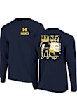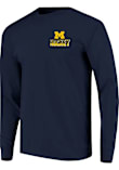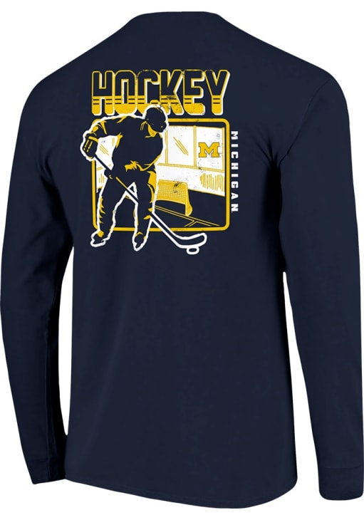 Show your Michigan Wolverines spirit in this Michigan Blue T Shirt! This Michigan 0 Hockey Stripe Long Sleeve T Shirt makes a great layer for cooler nights cheering on the Wolverines. Featuring a screen print team graphic on left chest and across back, this Michigan Wolverines Long Sleeve Tee is an essential addition for every fan. Go Michigan!