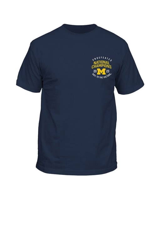 Display your team spirit with this remarkable Michigan Wolverines Blue 2023 National Champions Stadium Short Sleeve T Shirt! The Michigan Short Sleeve Tee showcases a screen print of football National Champions graphic on front chest that truly sets it apart. Stand out from the crowd and proudly declare your allegiance to the Wolverines with this exceptional Blue Michigan T Shirt. Go Michigan!