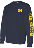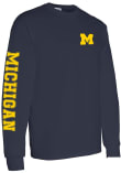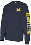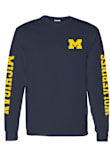 Show your Michigan Wolverines spirit in this Michigan Navy Blue T Shirt! This Michigan Double Sleeve Print Long Sleeve T Shirt makes a great layer for cooler nights cheering on the Wolverines. Featuring a screen print team graphic across chest, this Michigan Wolverines Long Sleeve Tee is an essential addition for every fan. Go Michigan!