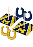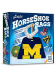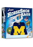 - Includes 2 all-wood game boards with 14" wood posts, 4 team-colored horseshoe bags, bag carrying case