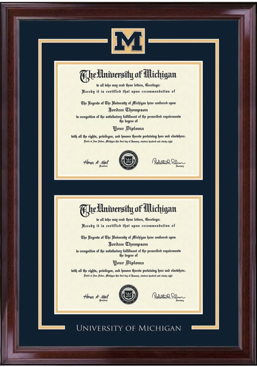 Michigan Wolverines Medallion Diploma Frame is a great way to keep your Wolverines memories close. You'll love looking at your favorite Wolverines moments with this Diploma Frame, which features a showcase for your University diploma in a USA-made frame. Overall Size 19.19"w x 26". Go Michigan!