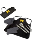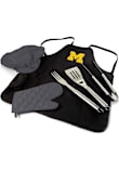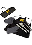 Product Details Product Details Folds into easy-to-carry toteAdjustable shoulder strapTote folds out in to apron with team logoDeluxe BBQ set stored in side3 stainless steel BBQ toolsComes with chef's hatPerfect for barbecues, picnics, and campingPolyester ToteImported Officially Licensed Michigan Wolverines Apron Set will show your {Mascot Alia} pride. This Apron Set features a team logo and will look great at any tailgate. Go Michigan!