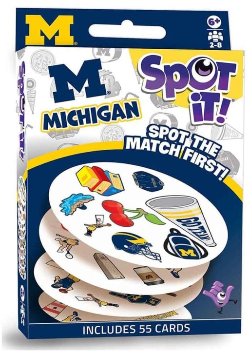 Product Details Product Details Suitable for ages 7+Includes: 55 cards and illustrated rulesMade for 2-8 playersHelp visual and scanning skillsImported Officially Licensed Have fun and show support for your team with this Michigan Wolverines Spot It! Game. This Game features a team logo with team colors for hours of Wolverines fun.