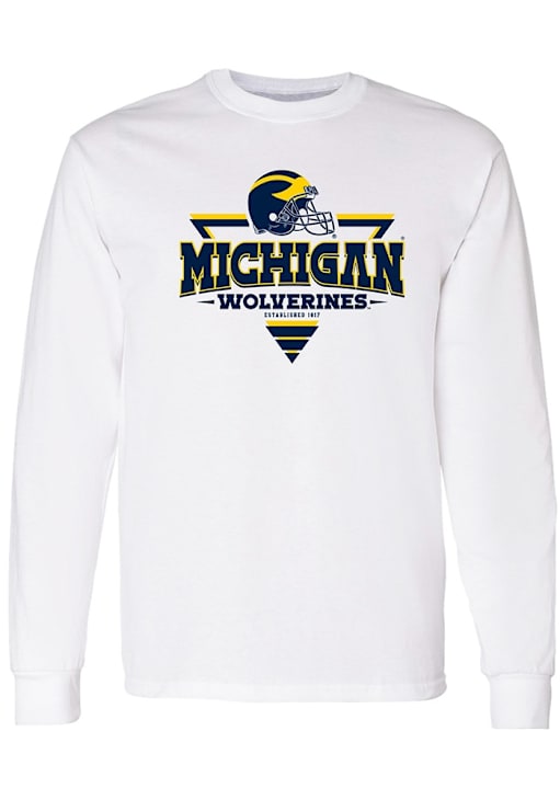 Show your Michigan Wolverines spirit in this Michigan White T Shirt! This Michigan Football Triangle Long Sleeve T Shirt makes a great layer for cooler nights cheering on the Wolverines. Featuring a screen print team graphic across chest, this Michigan Wolverines Long Sleeve Tee is an essential addition for every fan. Go Michigan!