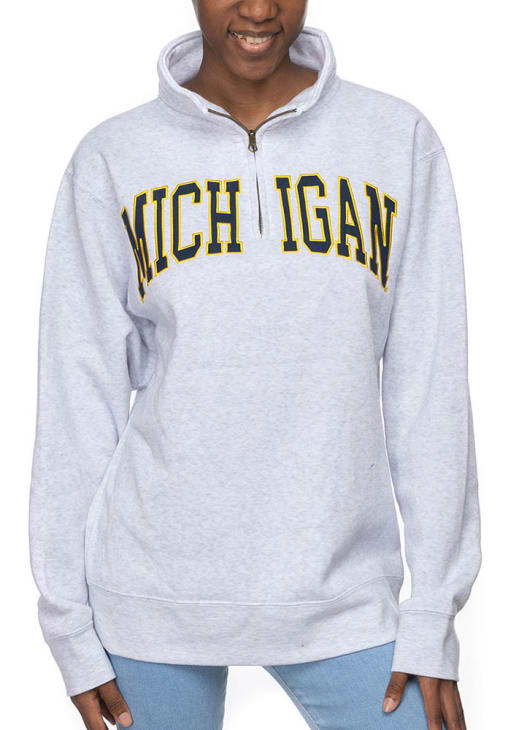 Embrace the warmth and showcase your Wolverines pride with our Michigan Wolverines Long Sleeve Qtr Zip. This Womens Ash Sport Long Sleeve Pullover offers a faux suede applique team name on center chest for the perfect combination of comfort and style. Elevate your everyday look with this must-have Michigan Wolverines Long Sleeve Qtr Zip.
