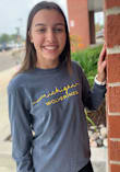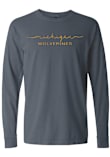 Show your Michigan Wolverines spirit in this Michigan Blue T-Shirt! This Michigan Script Long Sleeve T-Shirt makes a great layer for cooler nights cheering on the Wolverines. Featuring a screen print team name on chest chest, this Michigan Wolverines Long Sleeve LS Tee is an essential addition for every fan. Go Michigan!