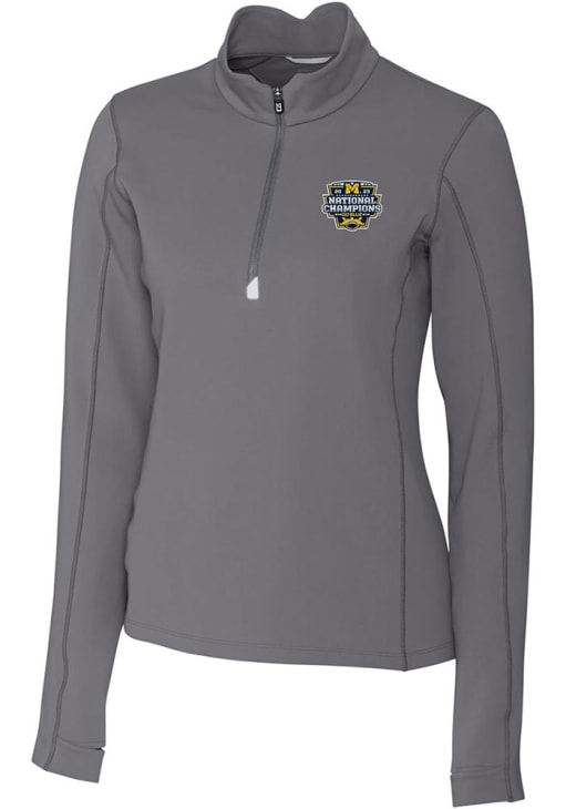 Embrace the warmth and showcase your Wolverines pride with our Michigan Wolverines Long Sleeve Qtr Zip. This Womens Grey 2023 College Football National Champions Traverse Long Sleeve Pullover offers a matte fabric finish for the perfect combination of comfort and style. Elevate your everyday look with this must-have Michigan Wolverines Long Sleeve Qtr Zip.
