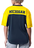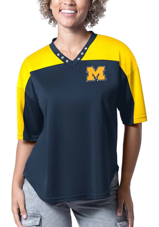 This remarkable Michigan Wolverines Womens Key Plan II Fashion Football Jersey, showcasing a screen print team logo with rhinestones on left chest and self appique team name with rhinestones on back yoke. Elevate your admiration for Michigan Wolverines as you embrace this exceptional piece, designed to impress.