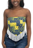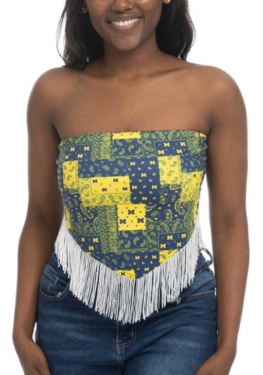 Elevate your tailgating style with this Michigan Wolverines Womens Tank Top. Stay fashionable and comfortable in the refreshing Navy Blue Bandana Fringe Sleeveless Shirt. Discover the enticing details of this Michigan Tank Top, showcasing a all over bandana print with team logos that's sure to impress.