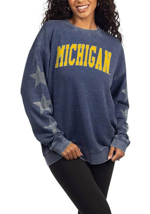Gear up for the ultimate game day experience with this remarkable Michigan WolverinesWomens Blue Rhinestone Stars Campus Crew Sweatshirt! Designed with the true fan in mind, this Wolverines Long Sleeve Sweatshirt features a metallic team name on center chest with rhinestone stars on both arms. Stay warm and comfortable with this Womens Michigan Wolverines Crew Sweatshirt.
