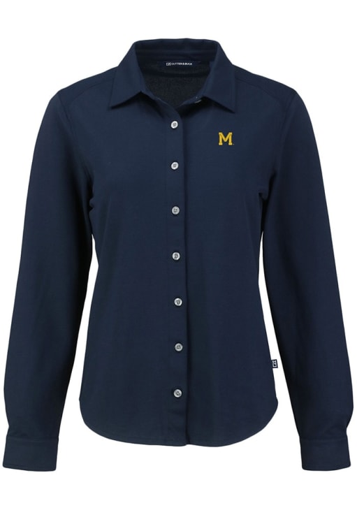 Show your Wolverines spirit show in the office with this Michigan Wolverines Dress Shirt! Embrace your team spirit and showcase it proudly in this Womens Navy Blue Vault Advantage Soft Pique Long Sleeve Long Sleeve Button Down Shirt. This Long Sleeve Dress Shirt features a team logo on chest.