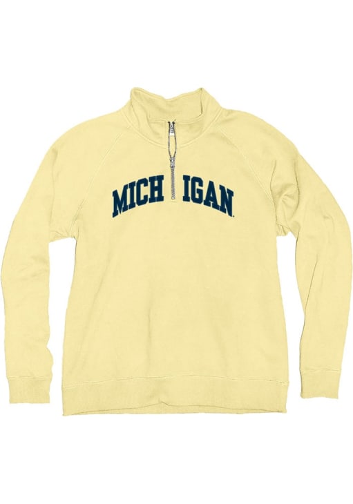 Embrace the warmth and showcase your Wolverines pride with our Michigan Wolverines Long Sleeve Qtr Zip. This Womens Yellow Sanded Fleece Long Sleeve Pullover offers a applique team name on center chest for the perfect combination of comfort and style. Elevate your everyday look with this must-have Michigan Wolverines Long Sleeve Qtr Zip.