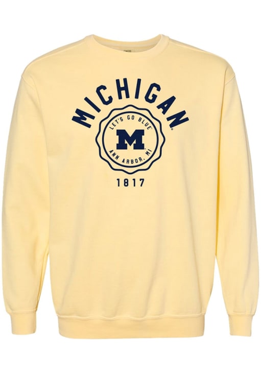 Gear up for the ultimate game day experience with this remarkable Michigan WolverinesWomens Yellow Seal Script Crew Sweatshirt! Designed with the true fan in mind, this Wolverines Long Sleeve Sweatshirt features a screen print team name and logo on center chest. Stay warm and comfortable with this Womens Michigan Wolverines Crew Sweatshirt.