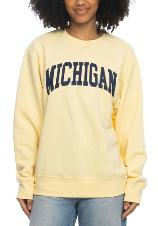 Gear up for the ultimate game day experience with this remarkable Michigan WolverinesWomens Yellow Sport Fleece Crew Sweatshirt! Designed with the true fan in mind, this Wolverines Long Sleeve Sweatshirt features a applique team name on center chest. Stay warm and comfortable with this Womens Michigan Wolverines Crew Sweatshirt.
