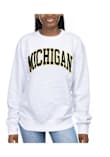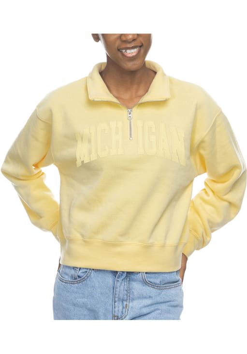 Embrace the warmth and showcase your Wolverines pride with our Michigan Wolverines Long Sleeve Qtr Zip. This Womens Yellow Sport Long Sleeve Pullover offers a faux suede applique team name on center chest for the perfect combination of comfort and style. Elevate your everyday look with this must-have Michigan Wolverines Long Sleeve Qtr Zip.