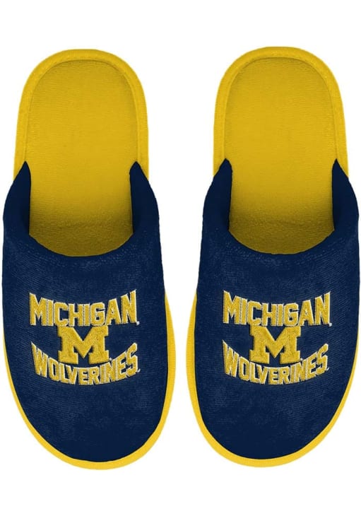 Product Details Product Details All over team-colored designEmbroidered team logo and wordmarkSuper soft plush materialGripped outsoles to avoid slippingGreat for watching the game from home!Small fits men's 7-8Medium fits men's 9-10Large fits men's 11-12XL fits men's 13-14 Officially Licensed Make gamedays more comfortable with these Michigan Wolverines Wordmark Stacked Big Logo Mens Slippers from Rally House! Show Wolverines support with these Mens Slippers featuring team logo with team colors.