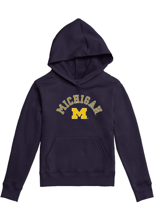Size Chart for Youth Navy Blue Michigan Wolverines Arch Outline Mascot Long Sleeve Hooded Sweatshirt