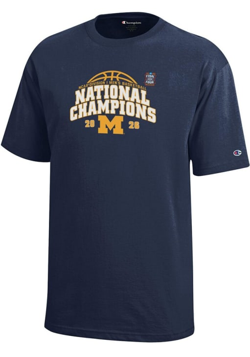 Size Chart for Youth Michigan Wolverines Navy Blue Champion MBB National Champs 2026 Core Short Sleeve T-Shirt