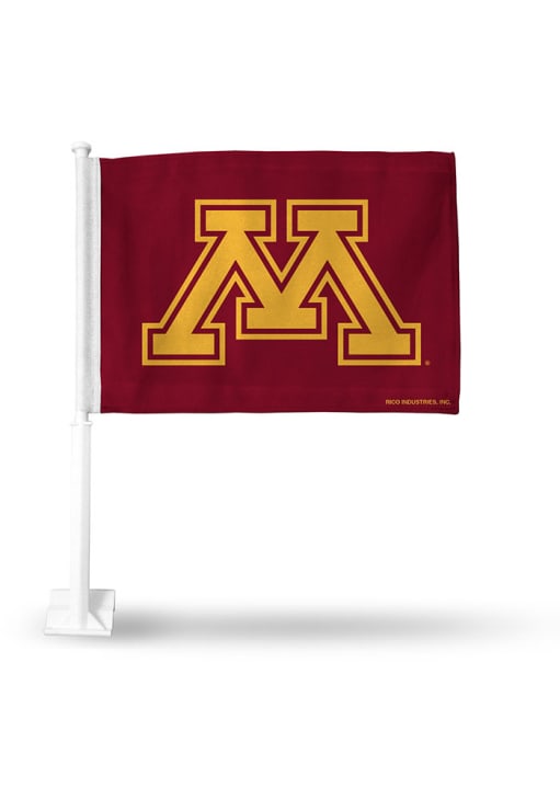 This Golden Gophers Car Flag features a team color and team logo.