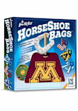 - Includes 2 all-wood game boards with 14" wood posts, 4 team-colored horseshoe bags, bag carrying case