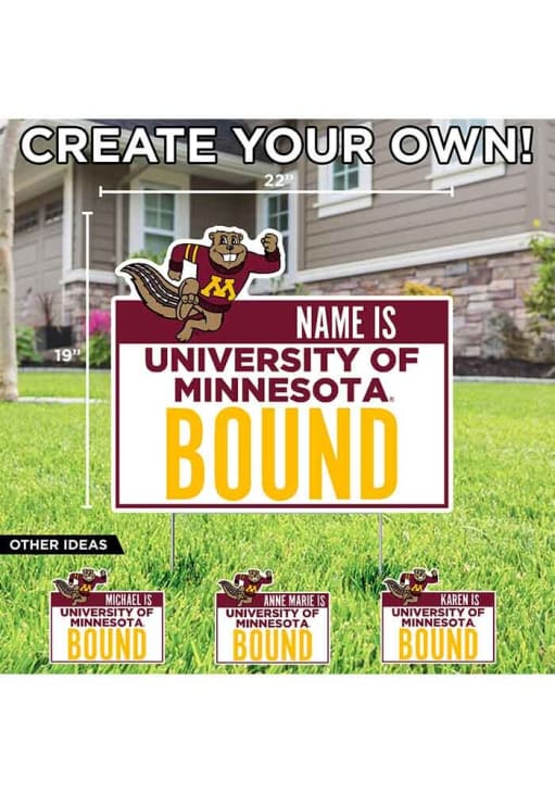 Product Details Product Details First Name ONLY.Approximatley 19"x22"Cut to Shape Weatherproof PlasticMetal Stakes IncludedFull Color PrintCustomized Bound Sign with your name! Officially Licensed Minnesota Golden Gophers Personalized School Bound Yard Sign will let everyone know you root for the Golden Gophers proudly. This Yard Sign features a weather resistant material.