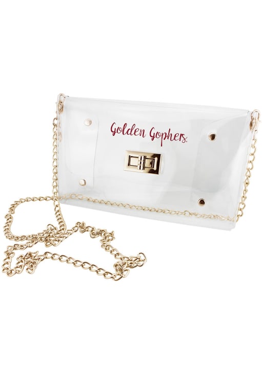 Product Details Product Details Clear PVC BodyGold or Silver Hardware AccentsDetachable Chain Crossbody StrapTurn Lock ClosureDimensions: 8" x 5" x 1.5" Officially Licensed Whether it's gameday or another occasion in the offseason, count on this Minnesota Golden Gophers Stadium Approved Envelope Clear Tote from Rally House for your on-the-go needs! You'll love this Clear Tote that features a detachable chain.