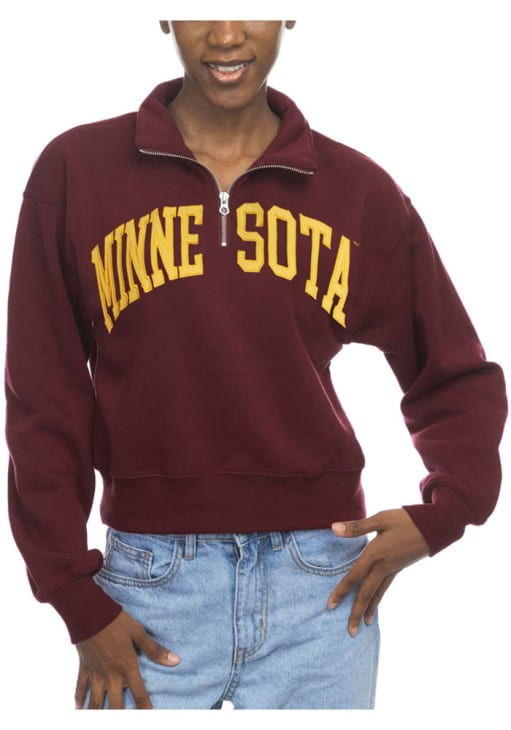 Embrace the warmth and showcase your Golden Gophers pride with our Minnesota Golden Gophers Long Sleeve Qtr Zip. This Womens Maroon Cropped Sport Fleece Long Sleeve Pullover offers a applique team name on center chest for the perfect combination of comfort and style. Elevate your everyday look with this must-have Minnesota Golden Gophers Long Sleeve Qtr Zip.