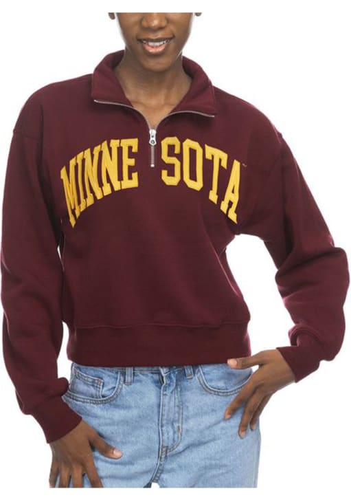 Embrace the warmth and showcase your Golden Gophers pride with our Minnesota Golden Gophers Long Sleeve Qtr Zip. This Womens Maroon Cropped Sport Long Sleeve Pullover offers a screenprint team name on center chest for the perfect combination of comfort and style. Elevate your everyday look with this must-have Minnesota Golden Gophers Long Sleeve Qtr Zip.