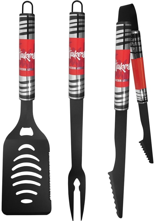 - Grill set includes: spatula with bottle opener and serrated edge, fork and tongs