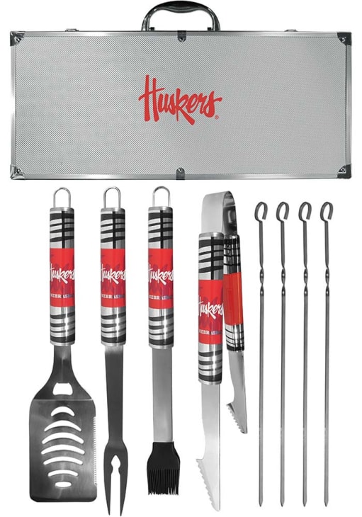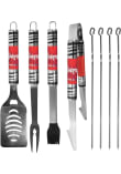 - Grill set includes: 4 skewers, spatula with bottle opener and serrated edge, fork and tongs