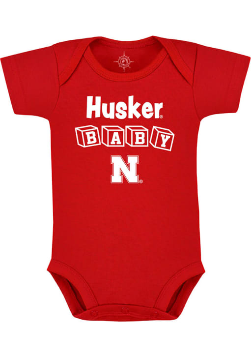 Your little Cornhuskers fan will look adorable in this Baby Red Nebraska Cornhuskers Baby Block Mascot One Piece! This Nebraska Cornhuskers Romper features a "Baby" screen print team graphic.
