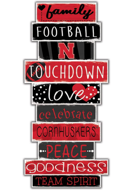 This Nebraska Cornhuskers Celebrations Stack 24 Inch Sign is great for decorating your home Cornhuskers team spirit. Take your team spirit to the next level with this Sign, which features a University of Nebraska logo. Celebrate some of life's most important things - Family, Football, Touchdowns, Love, Peace, Goodness, Team Spirit, and the University of Nebraska. This sign will look great in your family room, fan cave, office and more. Go Huskers!